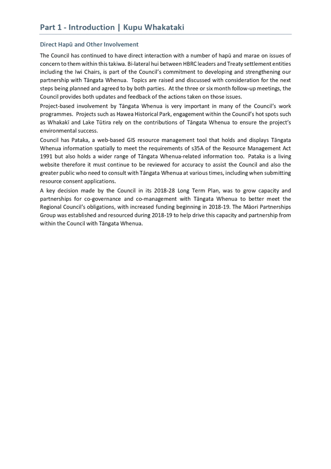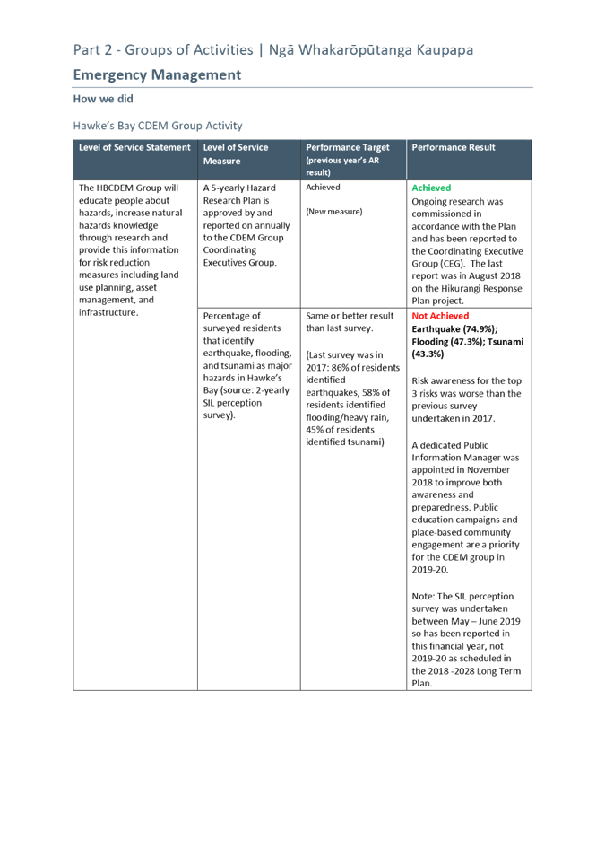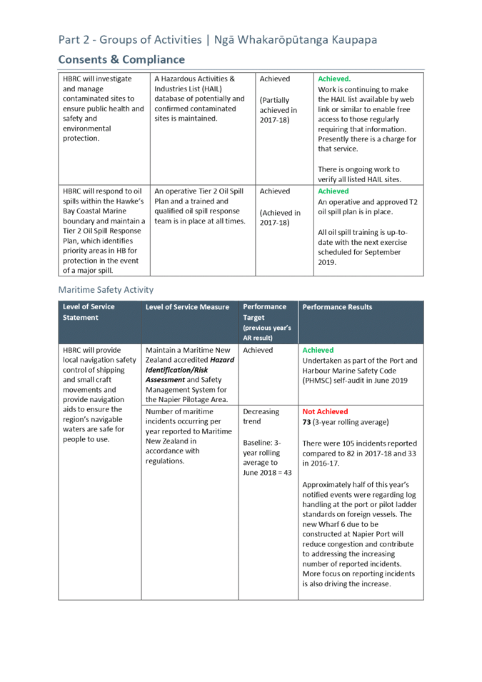Recommendation That Hawke’s Bay Regional Council: 1. Receives the “2018-19 Annual Report Adoption” staff report. 2. Receives the Audit New Zealand audit opinion on the 2018-19 Annual Report. 3. Adopts the audited 2018-19 Annual Report as presented, with any minor editorial corrections as necessary. 4. Authorises the Chair and Chief Executive to sign the 2018-19 Annual Report on behalf of Council. 5. Instructs staff to publish the 2018-19 Annual Report in its final form, within one month of today in accordance with legislative requirements. |