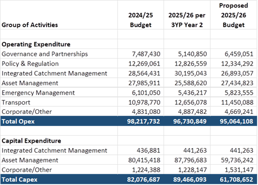 24. The operating spend budgets have then been further decreased by $1.7m to get to our proposed 2025-26 annual plan budgets. The main areas where cuts have been made are: Public Transport $1.2m to align to the reduced approved funding from Waka Kotahi; $3.3m of reduced expenditure across ICM (resulting in $1.8m of rating savings); and savings made across other areas. The opex budgets for three GOAs has increased – Governance and Partnerships due to higher than expected final applications in the wind up of sustainable homes (loan funded); Asset Management for the one off work required on scheme reviews and reimagining rivers (carbon credit and special dividend funded); and Emergency Management for transformation costs.