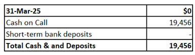 13. The following table reports the cash and cash equivalents on 31 March 2025.