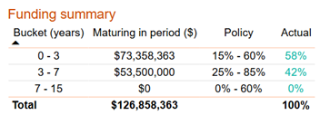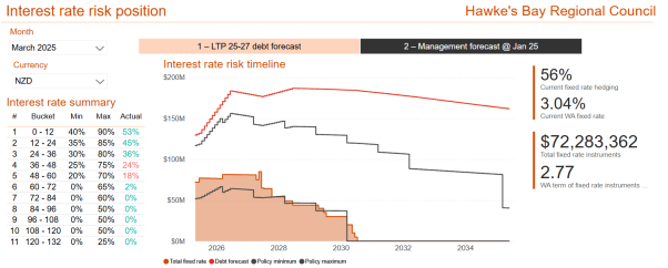 26. At 31 March Council held $72m in fixed rate instruments, hedging 56% of current external debt, and was outside policy, based on the FY2025-2027 LTP plan. However, Council’s Liability Management Policy states fixed rate maturity profile outside limits but self-correcting within 90 days is not in breach of this Policy. In April additional hedging was purchased bringing Council back within policy.