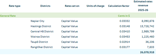 That Hawke’s Bay Regional Council: 1. Confirms that the decisions to be made on the setting and assessing of rates cover information in the Funding Impact Statement for the 2025-26 year, as included in the Annual Plan 2025-26 as required by Section 95 of the Local Government Act 2002. 2. Sets the following rates under the Local Government (Rating) Act 2002, on rating units in the region for the financial year commencing on 1 July 2025 and ending on 30 June 2026. These rates are set in accordance with the relevant provisions of the 2025-26 Funding Impact Statement and are inclusive of GST. 2.1. A general rate is set under sections 13, and 131 of the Local Government (Rating) Act 2002 on an estimate of projected equalised capital value as in the following table.