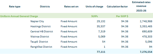 2.2. A uniform annual general charge is set at $94.36 per separately used or inhabited part of a rating unit (SUIP) under section 15(1)(b) of the Local Government (Rating) Act 2002 as in the following table.