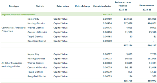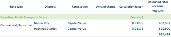 2.3. The following targeted rates, as described in the Funding Impact Statement, are set under sections 16, 17 & 18 of the Local Government (Rating) Act 2002 as in the following tables. 2.3.1. Subsidised Public Transport Direct – all commercial/industrial rating units in Napier and Hastings within a designated valuation roll footprint on an equalised capital value.
