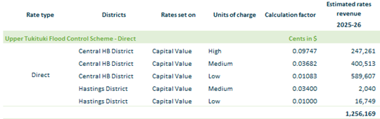 2.3.13. Upper Tukituki Flood Control Scheme Direct – based on rating units in Central Hawke’s Bay and Hastings District within the Upper Tukituki Flood scheme footprint on an equalised capital value.