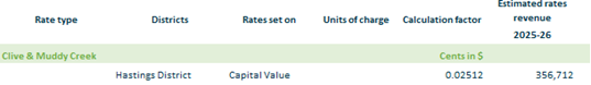 2.3.16.2. Clive & Muddy Creek – based on rating units in Hastings District within the Clive Muddy Creek drainage area on a capital value.