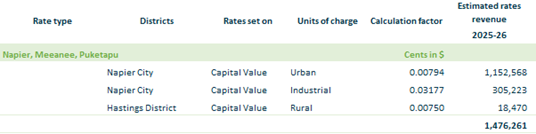 2.3.16.5. Napier, Meeanee, Puketapu – based on rating units in Hastings District and Napier City within the Napier, Meeanee, Puketapu drainage area on an equalised capital value.