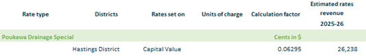 2.3.16.9. Poukawa Drainage – based on rating units in Hastings District within the Poukawa drainage area on a capital value.