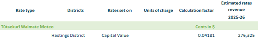 2.3.16.13. Tūtaekurī-Waimate & Moteo – based on rating units in Hastings District within the Tūtaekurī Waimate Moteo drainage area on a capital value.