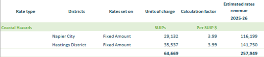2.4. The following uniform targeted rates, as described in the Funding Impact Statement, are set under sections 16 and 17 of the Local Government (Rating) Act 2002 as per the following tables. 2.4.1. Coastal Hazards – fixed amount per separately used or inhabited part, based on location.