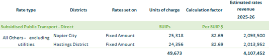 2.4.3. Subsidised Public Transport Direct– all non-commercial / non-industrial / non- utilities properties within Napier and Hastings in a designated valuation roll footprint based on a fixed amount per separately used or inhabited part of a rating unit.