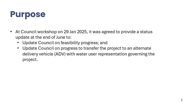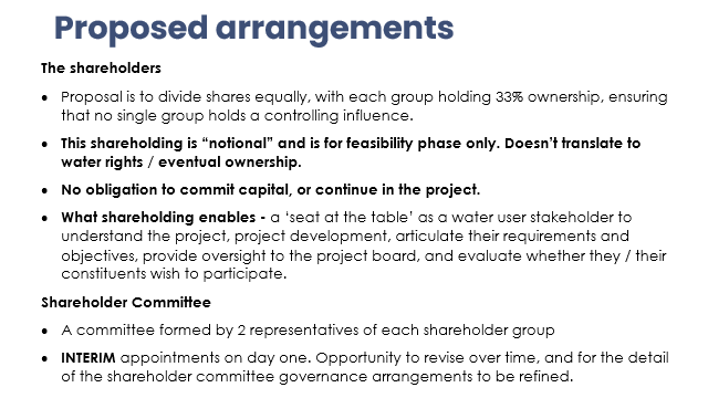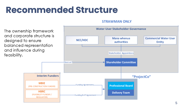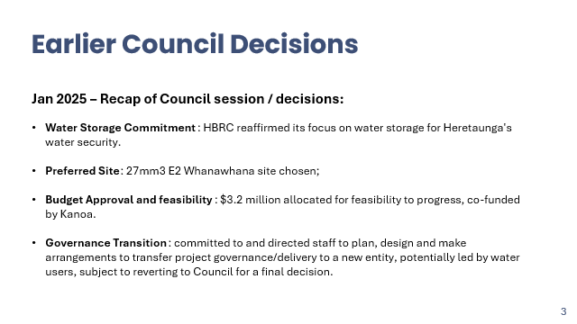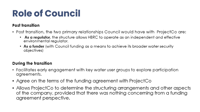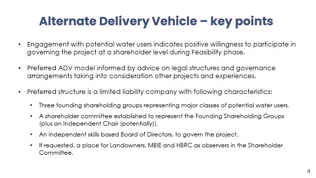 Xan Harding excused himself having declared a conflict of interest in this item. Richard Wakelin introduced the item, Richard Westbury and Amanda Langley, who provided a recap of the project’s progress to date; targeting end of July for Council decisions on the delivery vehicle and ‘transitioning’ the funding to that entity. The proposed delivery vehicle (presentation attached) is a limited liability company (not a CCO) owned by the shareholders – water users, TAs and mana whenua – with a Shareholder Committee and independent, professional Board of Directors. HBRC will step back to maintain independence from structuring arrangements (leaving it to the shareholders to navigate) and consider what is acceptable in terms of participation and commitment but retain the role of primary project sponsor (and funder) and manage the broader relationships as a regional authority. Te Wairama Munro advised that there are four mana whenua groups representing a variety of interests that have expressed a desire to be involved and are being actively engaged with. Discussions with Kānoa are ongoing, particularly in relation to the potential transition to an ADV and the funding agreement. Mike Paku left the meeting at 4.14pm |