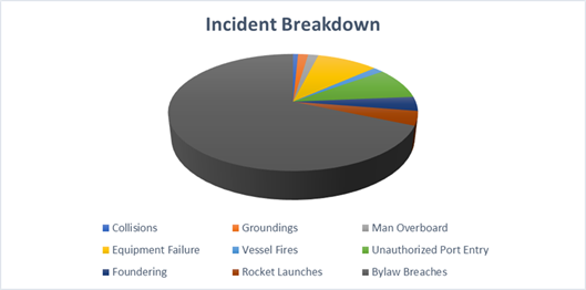 Although there has been an overall reduction in the number of reported incidents, there were more commercial incidents compared to the previous year. The majority of incidents continue to be from the recreational sector, specifically breaches of the Navigation Safety Bylaw. This highlights a need for a greater level of engagement with our recreational water users and efforts are underway to address this.